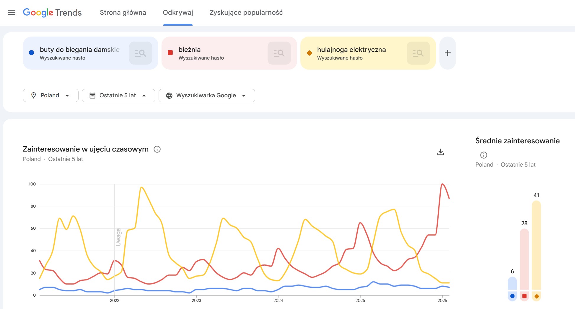 Następnie przeanalizuj, czy zainteresowanie danym produktem rośnie, spada czy może utrzymuje się na tym samym, stabilnym poziomie od lat.