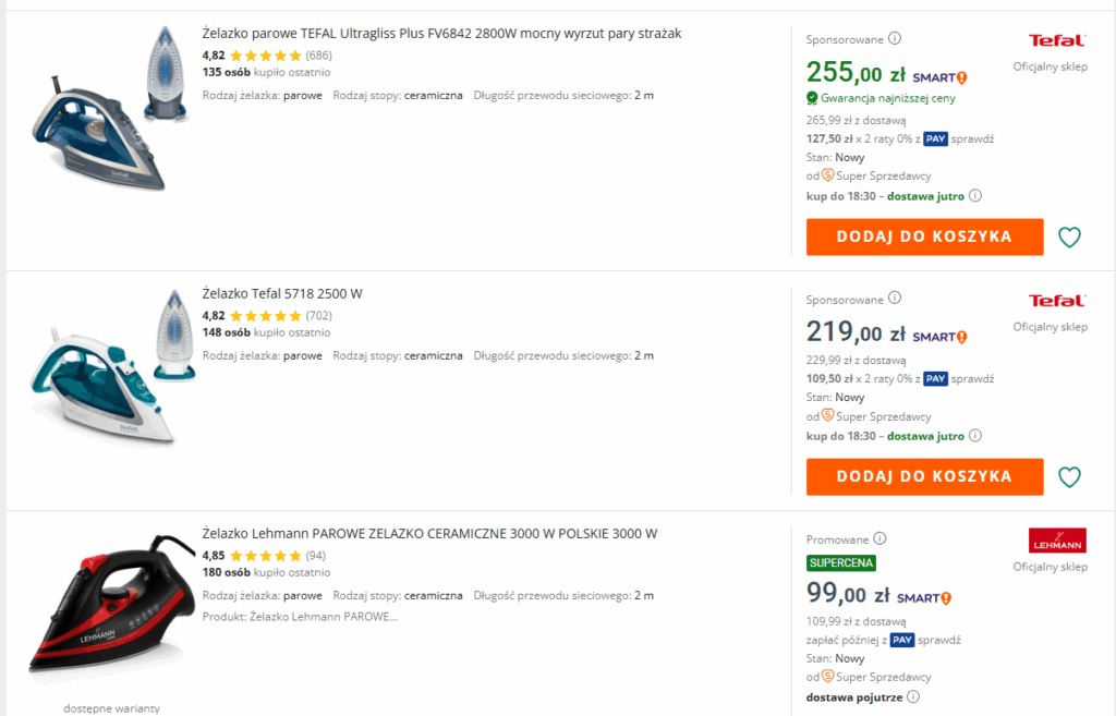 Spójrz, jak prezentują się wyniki, gdy w wyszukiwarkę Allegro wpiszę hasło “żelazko”: