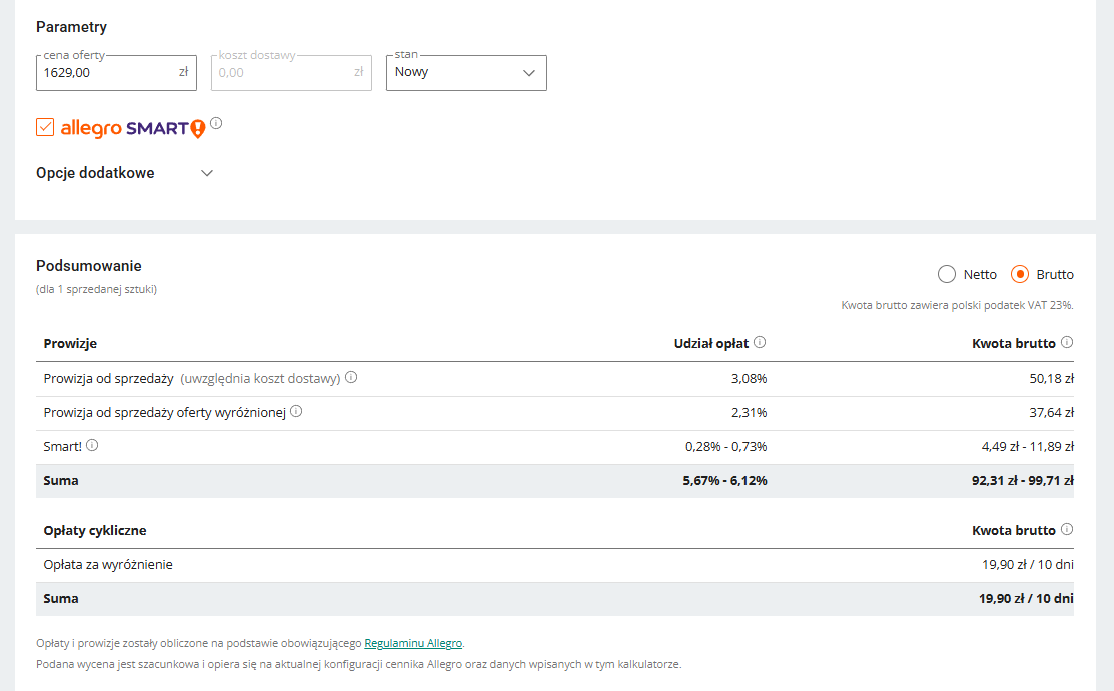 - za ewentualne opcje dodatkowe (jak np. Allegro Ads, promowanie ofert czy Abonament Allegro).