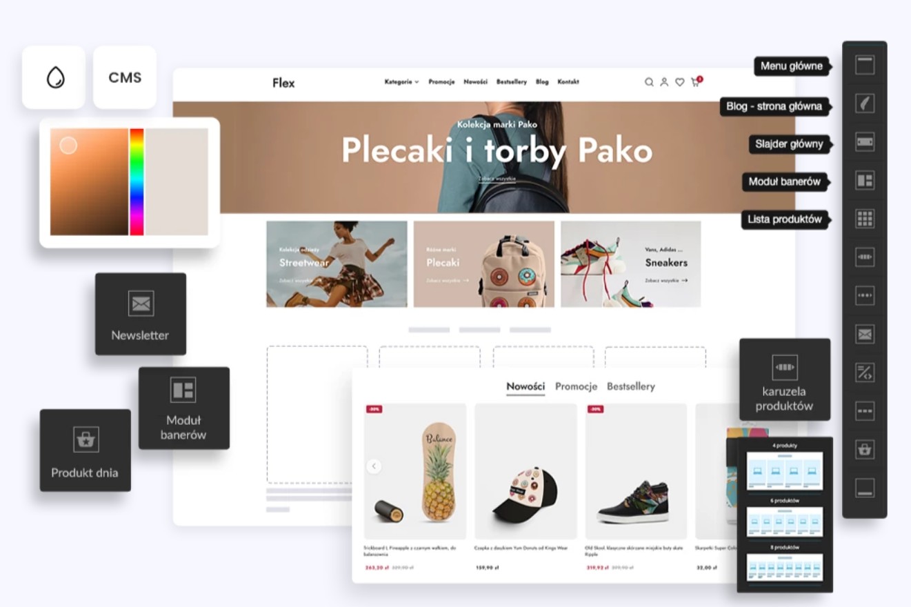 Sky-Shop daje Ci dostęp do gotowych szablonów, które edytujesz za pomocą intuicyjnego kreatora – bez ingerencji w kod. Dla większości sklepów to w pełni wystarczające rozwiązanie – szczególnie gdy priorytetem jest szybkość wdrożenia, a nie unikalny design od zera.